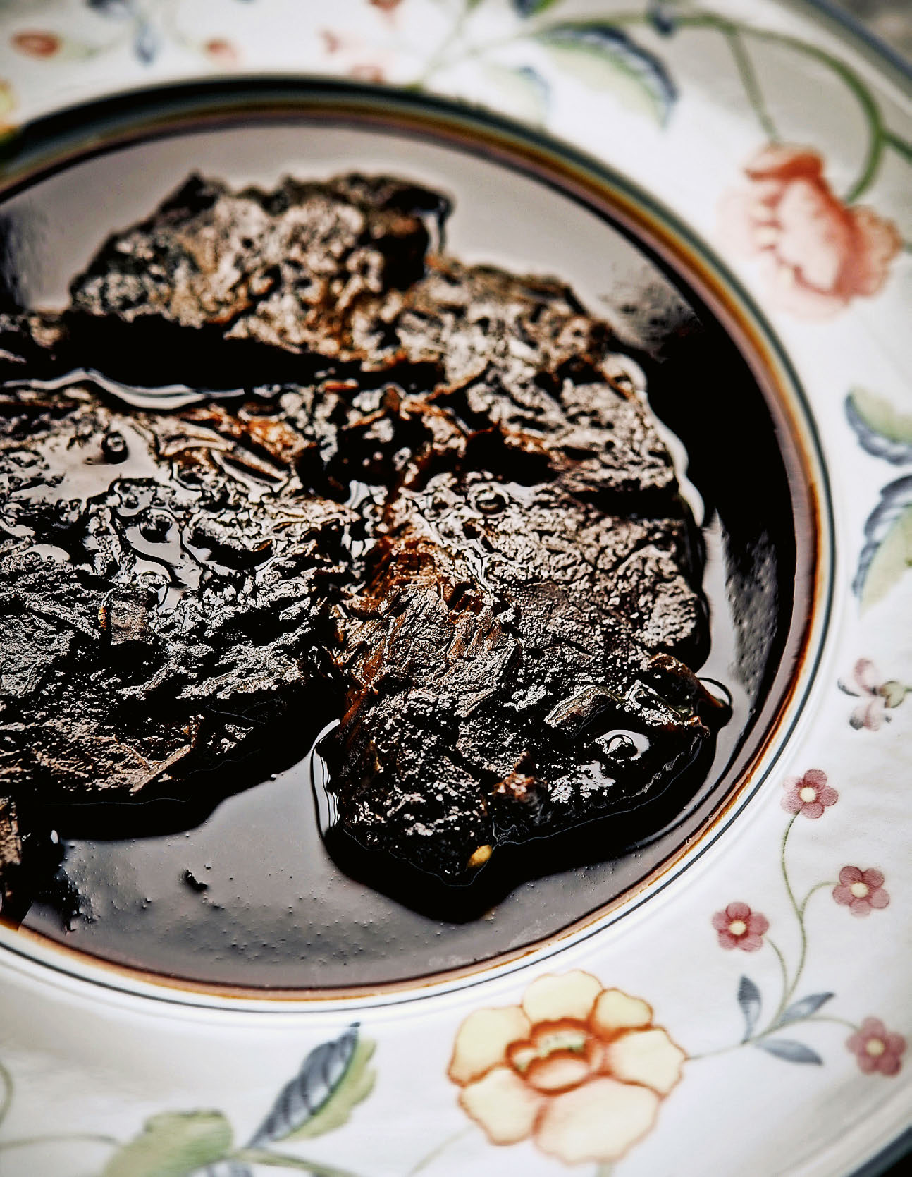 Fleisch vorsichtig (da es fast zerfällt) herausnehmen und in Folie wickeln, kühl stellen. Sauce passieren und auf einen Viertel der Menge einkochen. Mit allerbestem Balsamico abschmecken. Fleisch aufschneiden, in der Sauce auf kleinem Feuer für 15 Minuten erwärmen. Mit Beilage nach Belieben, etwa Polenta oder Kartoffelstock, servieren.