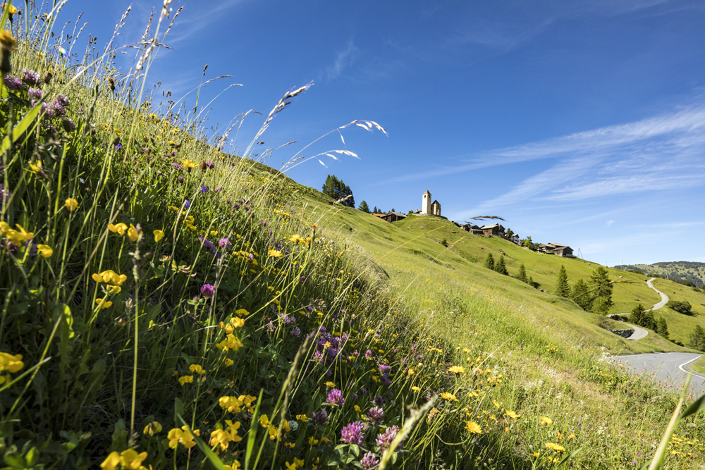So führt der Flower Walk durch die einzigartige Natur- und Kulturlandschaft des Naturparks, am Wegesrande leuchten u. a. Enzian, Wollgras, Arnika, betörend duften die Prachtnelken, es geht über farbenfrohe Mähwiesen, an Maiensässen vorbei. Der idyllische Libi-See auf halber Strecke lädt zu einer Rast (Start der Rundwanderung im romanischen Bergdorf Mathon, 10 km, 3 Std. 15 Min.). Etwas länger mag man sich im pittoresken Bergdorf Lohn aufhalten und sich einklingen auf dem Klangweg durch duftende Wiesen und schattige Bergwälder. Über 20 Klanginstallationen entführen in einen genussvollen Ohrenschmaus: Wind bringt Objekte zum Klingen, andere kann man selbst zum Klingen bringen.