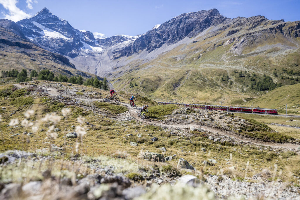 ENGADIN St. Moritz – Mountainbiker auf der Bernina Express Route 673, mit der Rhaetischen Bahn im Hintergrund.