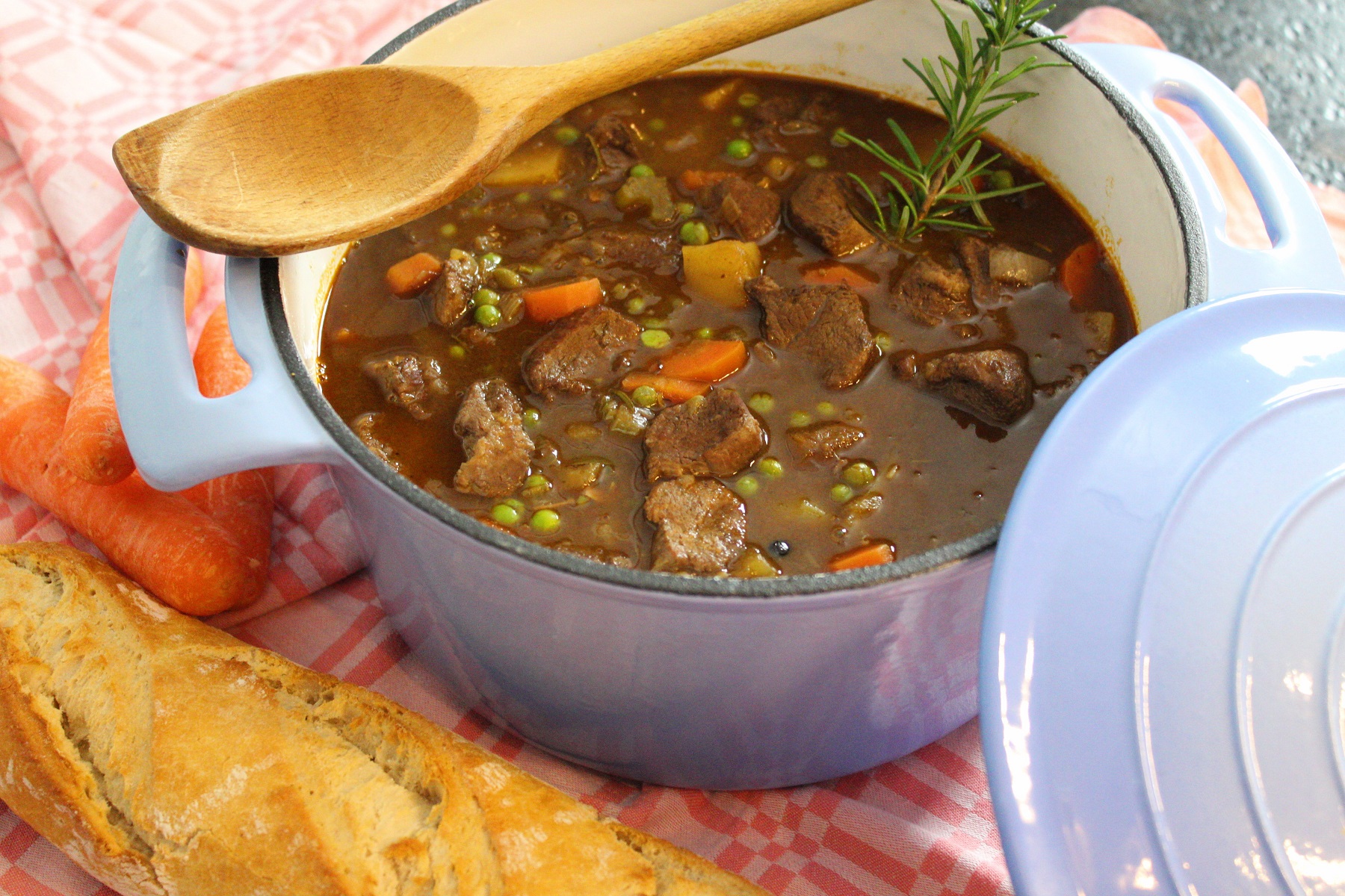 - Die in Scheiben geschnittenen Karotten/ Staudensellerie und die geschälte und in Würfel geschnittenen Kartoffelstücke beigeben. Für eine weitere Stunde mit geschlossenem Deckel köcheln lassen.