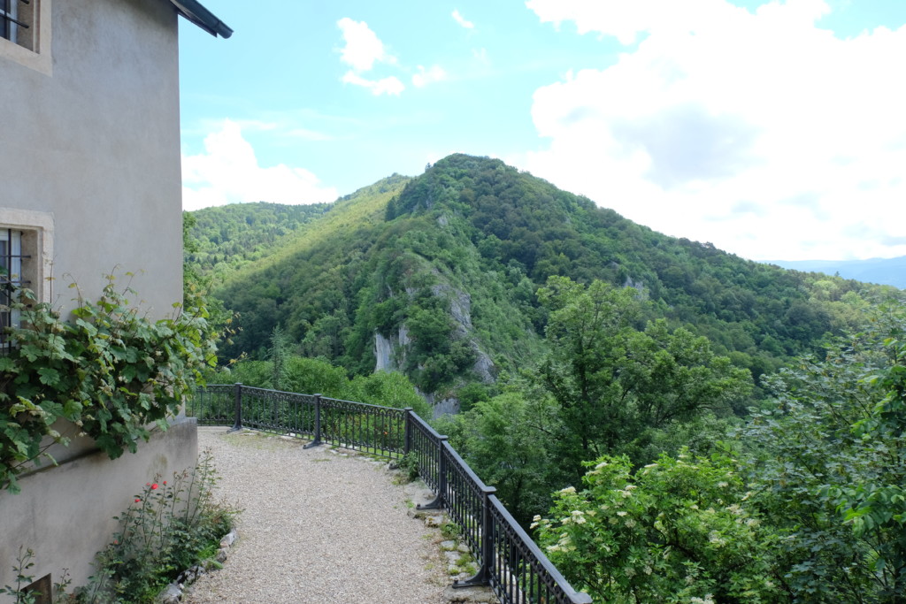 Kapelle und Burgruine Vorbourg liegen hoch über der Klus der Birs, mit Blick auf die Ebene des jurassischen Hauptortes Delémont