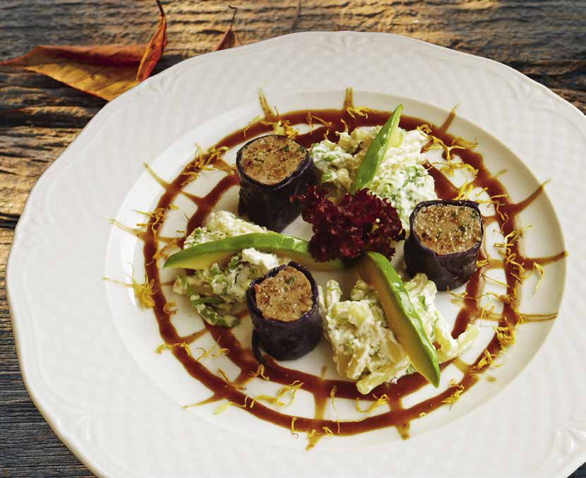 Rotkrautblätter im Salzwasser blanchieren, mit der Farce füllen. Mit dem Speck umwickeln. Mit einem Dampfeinsatz 15–20 Minuten garen. Zucker in einer Pfanne karamellisieren, mit Rotwein ablöschen, mit Kümmel, Salz und Pfeffer würzen. Die Rouladen in die Sauce setzen, mit Deckel 5 Minuten reduzieren und ab und zu schütteln. Mit etwas Butter verfeinern. Die gekochten grünen Nudeln in einer Pfanne mit Walnussöl erwärmen, Kopfsalatstreifen zufügen, mit geschlagenem Rahm umrühren und schnell auf dem Teller verteilen, die Roulade in der Mitte durchschneiden und anrichten, mit der Sauce übergiessen. Garnieren mit frittiertem Rosmarin.