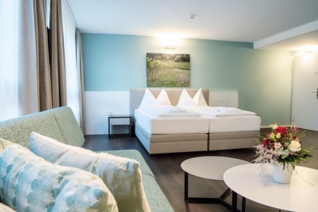 Eines unserer neu renovierten Doppelzimmer mit Blick in den Park