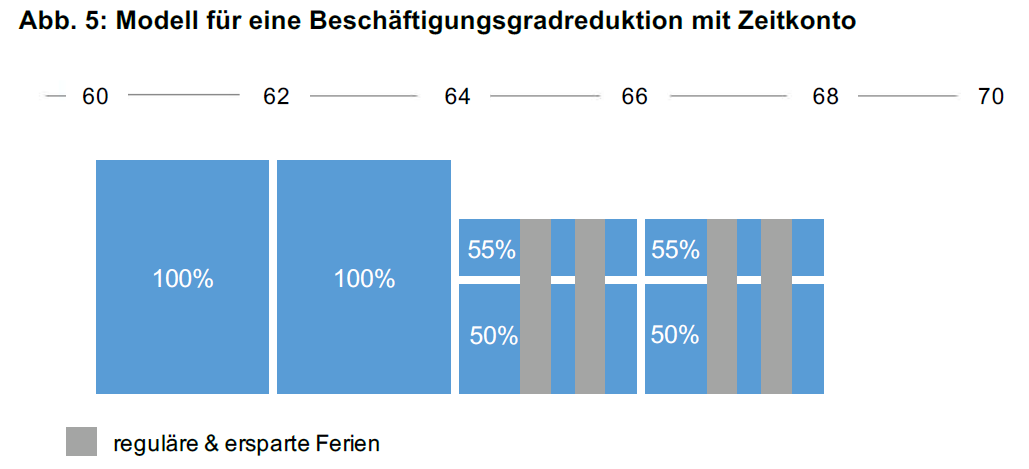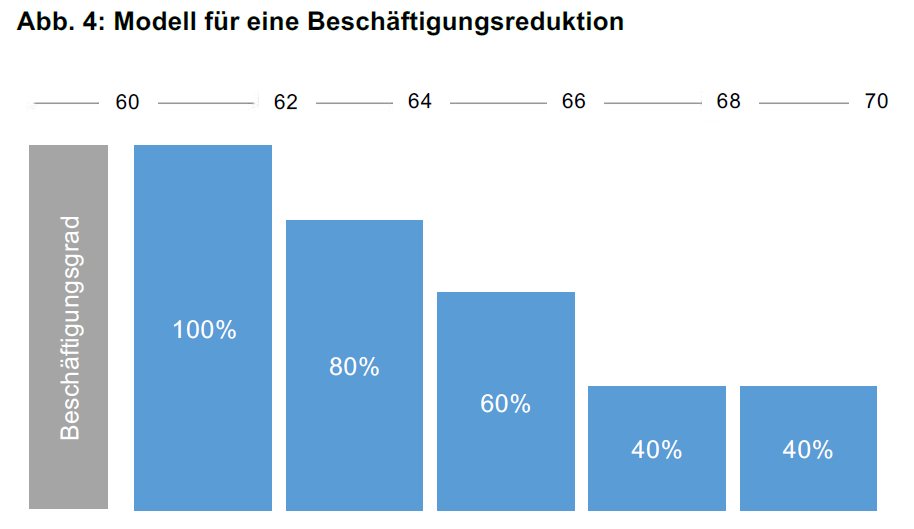 Nebst der Regeneration für einen Wiedereinstieg, braucht es auch flexible Beschäftigungsmodelle. Denkbar wäre die Reduktion des Beschäftigungsgrades. Das Pensum eines Mitarbeitenden reduziert sich ab einem gewissen Alter und pendelt sich beim konstanten Niveau von z.B. 40% ein (vgl. Abb. 4) oder man kombiniert einen flexiblen bzw. reduzierten Beschäftigungsgrad mit einem Zeitkonto.