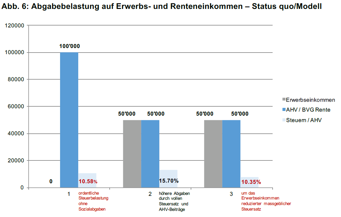 Auch im Steuersystem sind Anreize denkbar. Wenn tiefe Renteneinkommen die ordentlichen Lebenshaltungskosten nicht mehr zu decken vermögen und bspw. an Stelle von Ergänzungsleistungen weitergearbeitet wird, soll die sich dadurch ergebende gesamte Steuer- und Abgabebelastung nicht höher ausfallen. Eine Möglichkeit wäre, dass nach der Pensionierung das Erwerbseinkommen nur zum Steuersatz der Renteneinkommen steuerlich belastet wird (vgl. Abb. 6).