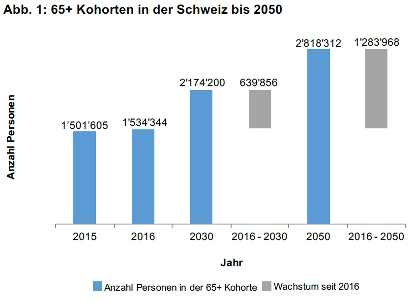 Bis 2030 wächst die Gruppe der 65+ -jährigen im Durchschnitt um 45‘000 Personen pro Jahr. Ab 2030 schwächt der Wachstum ab, bleibt aber bei 32‘000 Personen jährlich. (Quelle: Referenzszenario A-00-2015 des BFS)