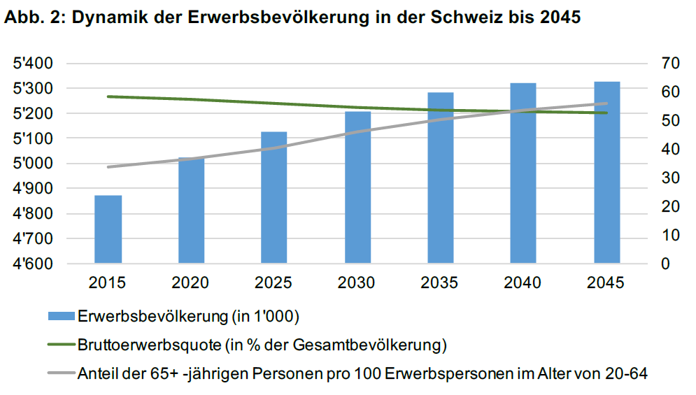 Immer mehr Menschen in der Schweiz leben länger und bleiben erfreulicherweise bis ins hohe Alter erstaunlich aktiv und mobil. Fakt ist aber auch: Die Berechnungsgrundlagen unserer Vorsorgewerke gehen von einer geringeren Lebenserwartung aus und die Erwerbspersonen (u.a. Grundlage eines funktionierenden Generationenausgleichs) entwickeln eine andere Dynamik. Von 2015 bis 2045 nehmen die über 65-Jährigen um ca. 1.1 Mio. zu, während die erwerbsfähigen 20- bis 65-Jährigen nur um 450’000 zunehmen; so die Annahme des Bundesamts für Statistik (vgl. Abb. 2).