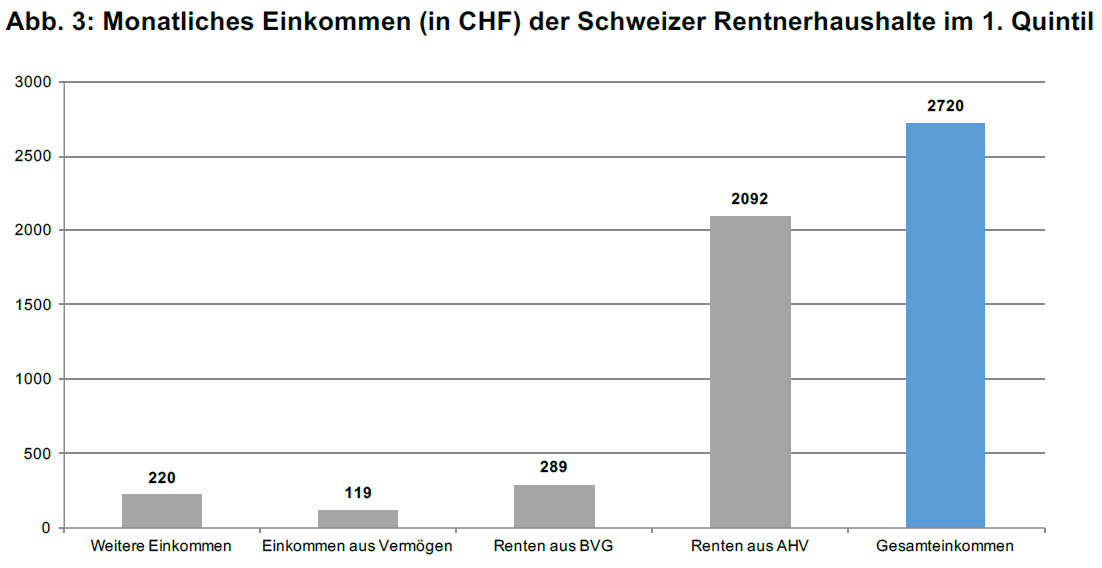 Rentnerhaushalte im ersten Quintil beziehen ihr monatliches Einkommen hauptsächlich aus der AHV. (Quelle: Credit Suisse AG, 2017)