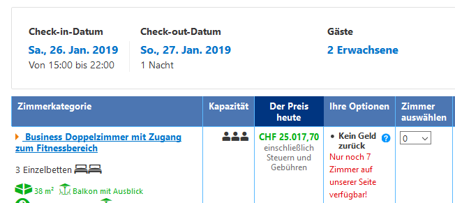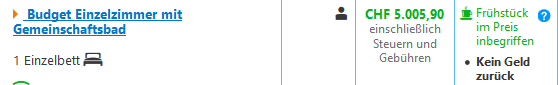 Wir geben uns also bescheiden und suchen, zum gleichen Zeitraum und im gleichen Haus, ein Budget-Einzelzimmer mit Gemeinschaftsbad, Frühstück inbegriffen und immerhin einschliesslich Steuern und Gebühren. Über die Doppelbelegung könnte man ja vielleicht vor Ort diskutieren. Da kommen wir richtig gut weg und sparen etwas mehr als CHF 20’000.